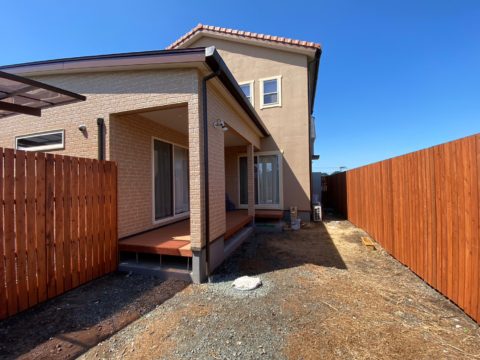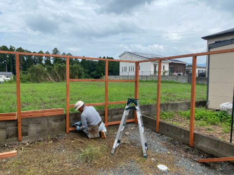 木製フェンスは、既存のコンクリートブロックを利用して支柱を建てて設置しました。約300枚あるフェンスの板の塗装が結構大変でしたが、無事完成しました!