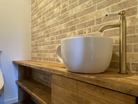 手洗いボウルには、お客様のご希望によりマグカップ状の可愛らしい物を設置!カウンターの奥行にギリギリでしたが、無事に設置できて良かったです!
