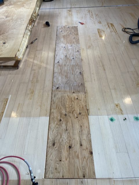 床の下地材である構造用合板も水漏れの影響で濡れていたため、工事の日数を空けて乾かしました。乾いた後に床の高さを調整するための合板の設置を行いました。