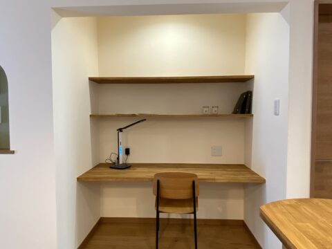 ・リビングの一角にカウンターデスクを造作:既製品の机を置くのではなく、お部屋の角や窓際に合わせて棚板を設置します。インテリアを損なわず、家族の気配を感じながら集中できる場所が作れます。